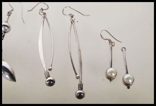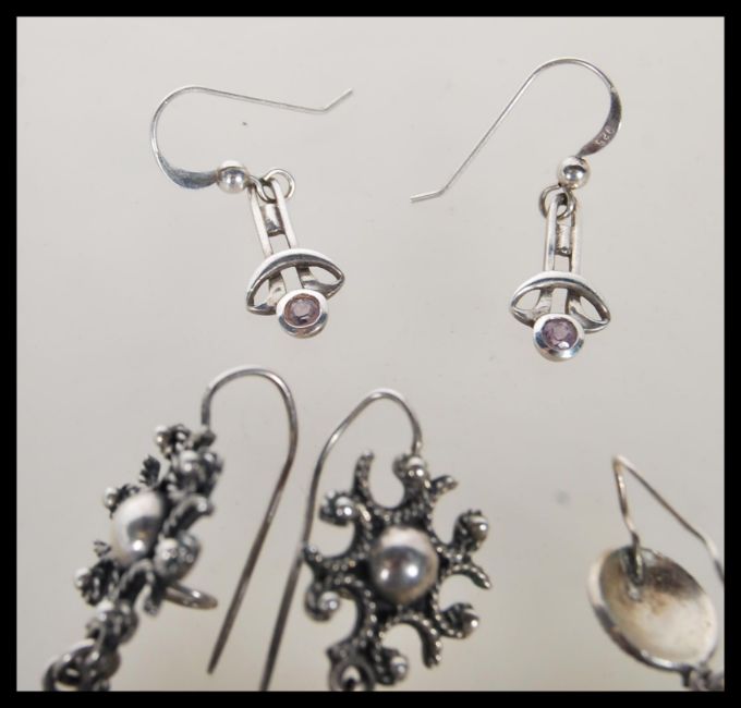 A selection of silver earrings to include a pair of drop earrings set with pearls, a pair of knot earrings set with purple stones, a pair of disc drop earrings, a pair of beaded drop earrings etc. Total weight 60.0g.