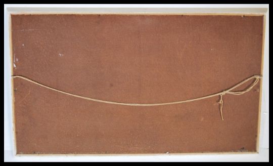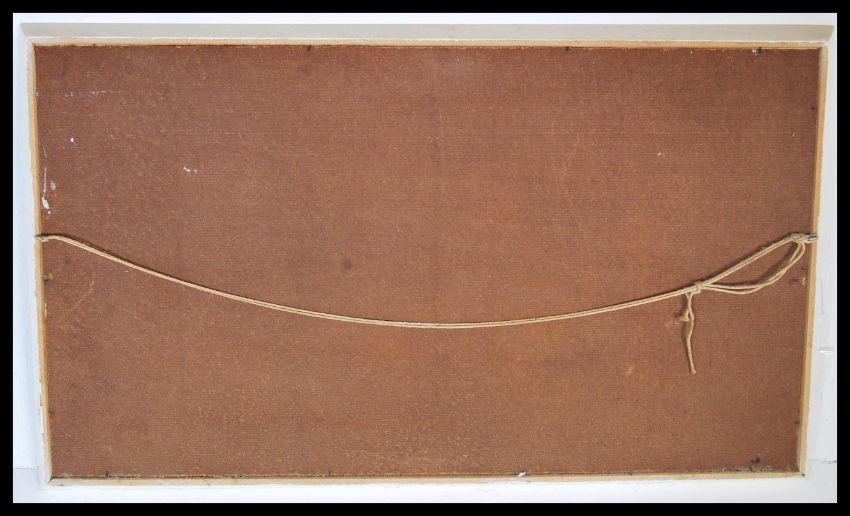 A vintage mid 20th century oil on board knife painting by Bill Hawkes. A 1970's oil on board of a seascape harbour scene in the original frame being signed to the corner. Measures 48Hx82Wcm.