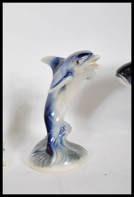 A collection of three 20th Century vintage retro ceramic lustreware model figures by Jema (Holland),  impressed maker's marks and model numbers to base. Tallest measures 32cm. Together with a vintage retro large 20th Century ceramic lustreware model of a freshwater Bream (No 353) figure by Jema (Holland),  impressed maker's marks and model number to base. Longest measures 38cm