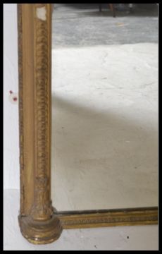 A good early 19th century very large gilt wood overmantel mirror. The large frame with gilded finish and carved, shaped detailing culminating in a crest top detailed centre. Measures 145cm high x 123cm wide.