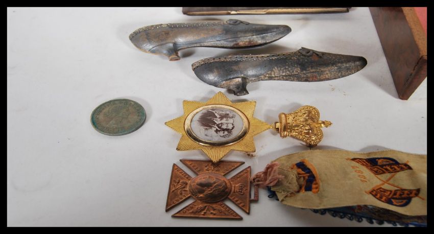 A collection of early 19th Century Victorian and later items to include commemorative medals, Golden Garlands book, miniature shoes, purse etc.