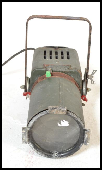 A pair of mid 20th century Strand Electric Theatre Spotlights in an unusual green colourway with brackets fixed atop. Measures 20cm high x 18cm wide x 46cm depth