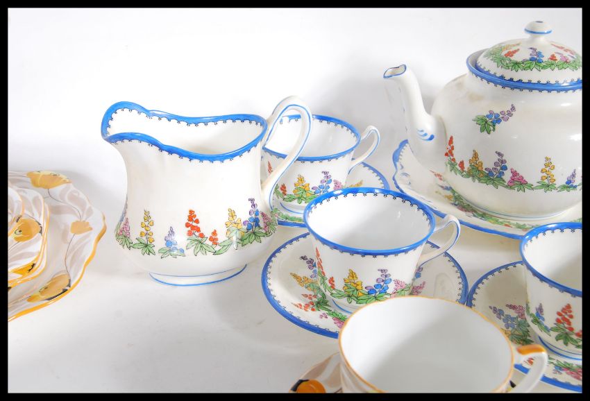 ). A 1930's Art Deco Grafton China part tea service to include cups, saucers, plates all being stamped to base together with another 1930's Art Deco pattern tea service in a chintz pattern with blue borders comprising teapot, cups, saucers, plates, sandwich plate, sugar bowl, creamer etc