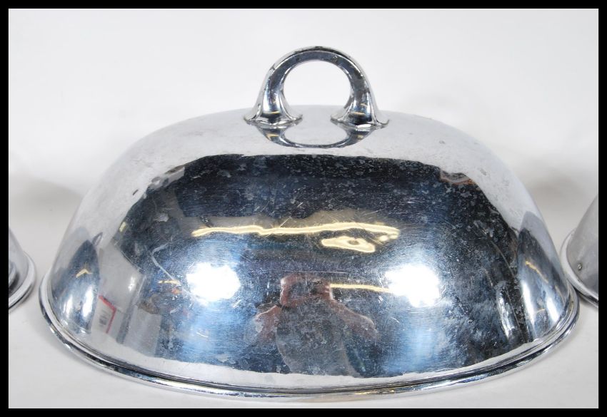 A set of three graduating late 19th Century / early 20th Century silver plated meat cloches / covers of plain undercoated form with handles to the top/