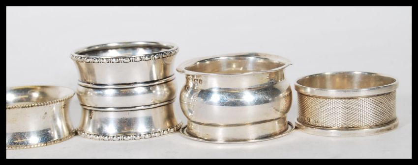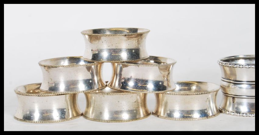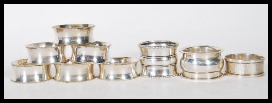 A collection of silver napkin rings to include an engine turned ring engraved with E. S. initials(hallmarked Birmingham 1940), a three tiered napkin ring with gadrooned borders (hallmarked Birmingham 1910), a flared rim napkin ring  (hallmarked Sheffield 1913) and a set of six unmarked silver white metal concave napkin rings with gadrooned edges. Gross weight 169g.
