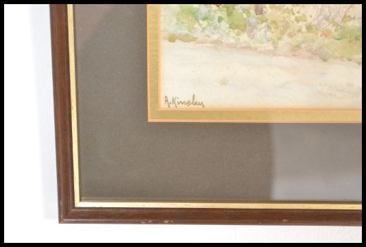 Albert Kinsley R.I, R.C.A (b. 1852)- A pair of framed and glazed watercolours one entitled 'On the cornish coast' and another having a winter scene and village to background. Both signed A.Kinsley, having Royal institute of painters in water colours black label to verso. Measures 39cms x 30cms.