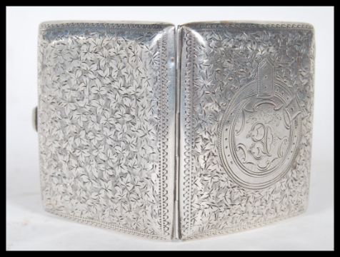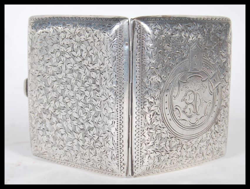 A silver hallmarked cigarette case having engraved foliate decoration with a circular belt engraved to the centre with initials inside. Hallmarked Birmingham 1902. Weight 86.8g.Measures 8cm x 7cm.