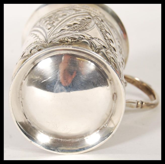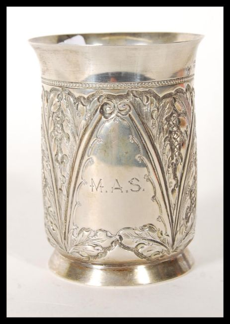 A 19th Century Victorian silver hallmarked Christening cup having repousse foliate detailing, being engraved M. A. S., being raised on a round foot and having a shaped handle. Hallmarked Birmingham 1899. Weight 102.2g.Measures 8cm high.