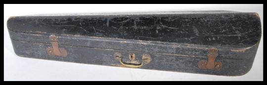 An Antique 19th Century Violin musical instrument having a two piece maple back with spruce front. Ebonised neck and tuning peg. Complete in fitted case, with bow having mother of pearl detailing.
