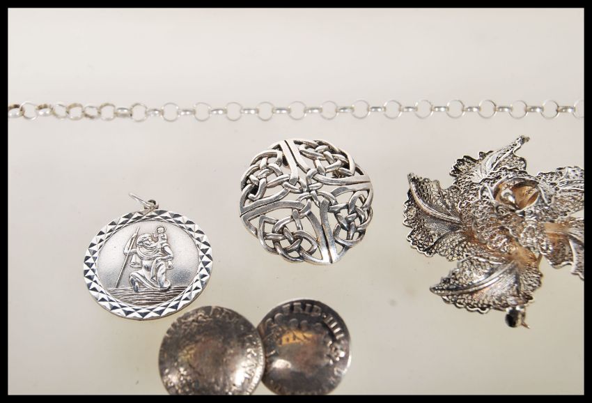 A selection of silver jewellery, mostly stamped 925,  to include a snake link Pandora bracelet, a figaro chain bracelet, a fob chain with a toggle, a Celtic knot brooch, a St Christopher pendant and a filigree flower brooch. Total weight 70.6g.