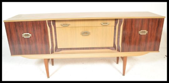 A vintage retro 20th Century two tone melamine sideboard / credenza, central bank of drawers flanked by cupboards raised on tapering supports. Measures 78cms high x 182cms wide x 44cms deep.
