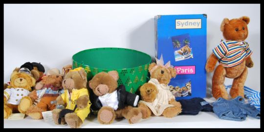 A collection of teddy bears to include, seven bears from the Teddy Bear collection comprising of Clint the cowboy, Captain Nuno, Fergus the Fisherman, Harvey the Huntsman etc. Together with a limited edition Travel bear having accessories and in suitcase box and two other bears.