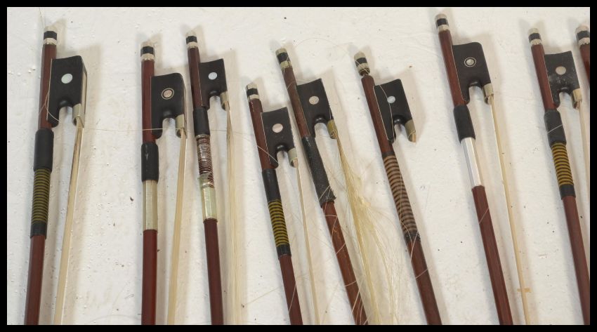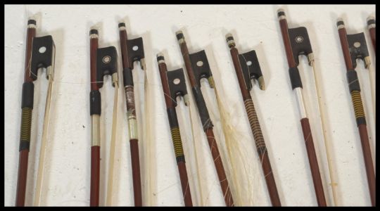 A collection of 20th Century violin bows, most bows being brazilwood and Pernambuco with ebony, ivory and mother of pearl detailing and horse hair. Twenty-one ( 21 ) in total.