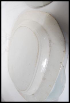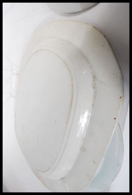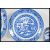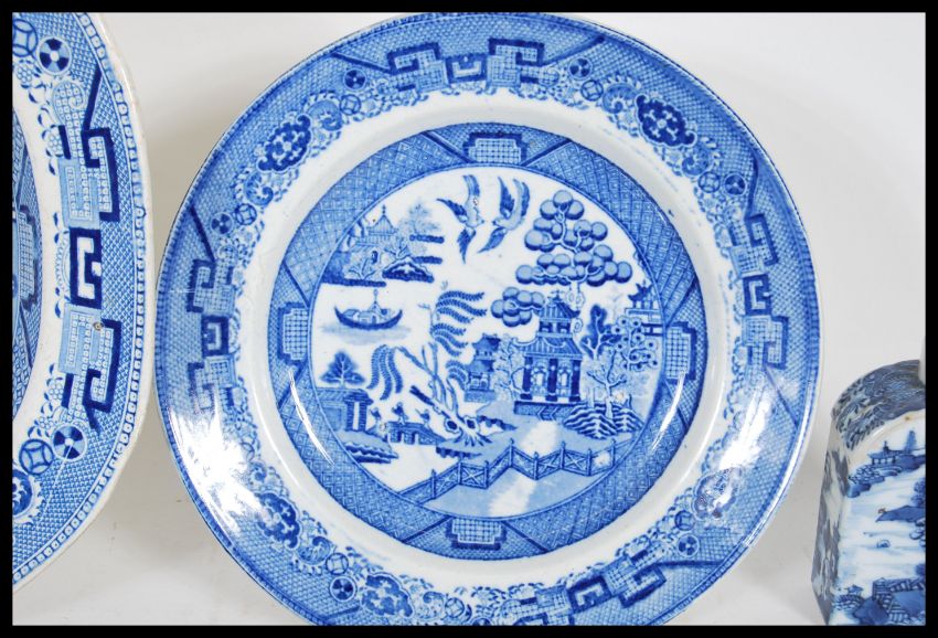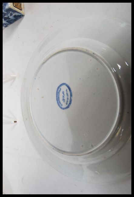 A group of 20th Century blue and white ceramic wares to include a Chinese inkwell having oriental scenes, willow pattern meat plate, a marked Staffordshire willow pattern plate and two matching Chinese plates having floral decoration and geometric pattern borders.