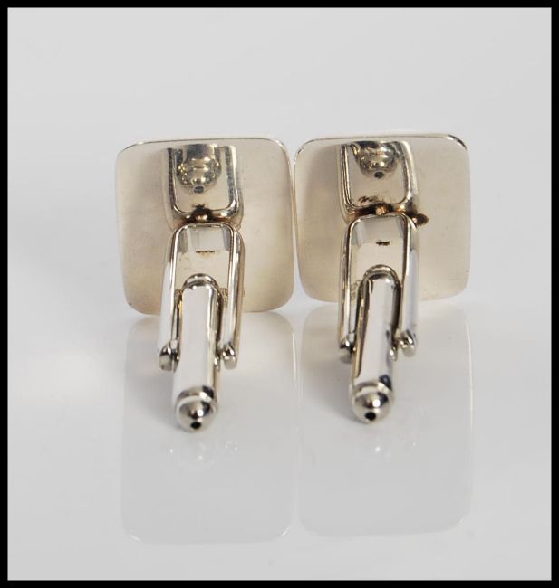 A pair of sterling silver and enamel cufflinks depicting an erotic scene involving a nude lady. Weighs 12.7g.