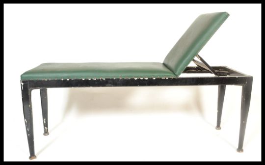 An early 20th century antique pine framed medical doctors examination table / couch / bench. The Examining table being adjustable to one end upholstered in a leatherette material raised on an ebonised pine frame. Measures 78cm high x 58cm wide x 183cm depth