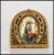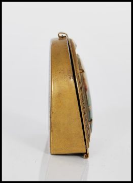 A 20th Century brass vesta case of domed form having repousse decoration of a horseshoe with an oval mother of pearl panel having a religious scene of Madonna and child. Measures 5cm high.