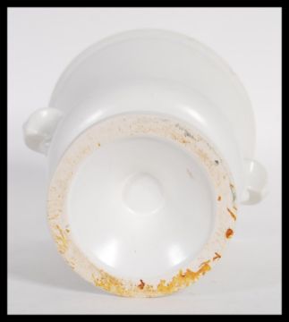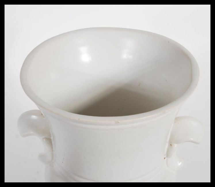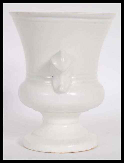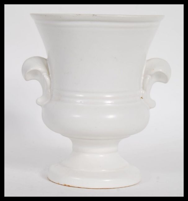 A vintage 20th century cream glazed pottery plant vase / table centerpiece, influenced by florist and designer Constance Spry for Fulham Pottery having twin shaped handles raised on a stepped circular base. Impressed Fulham pottery marks to base. Measures 15cm high x 47cm width.