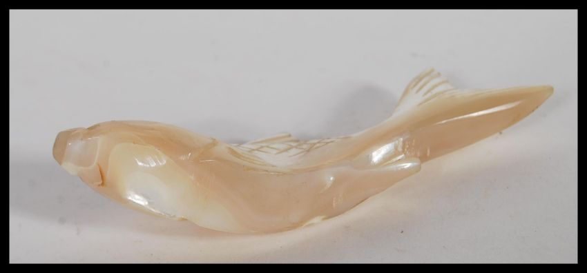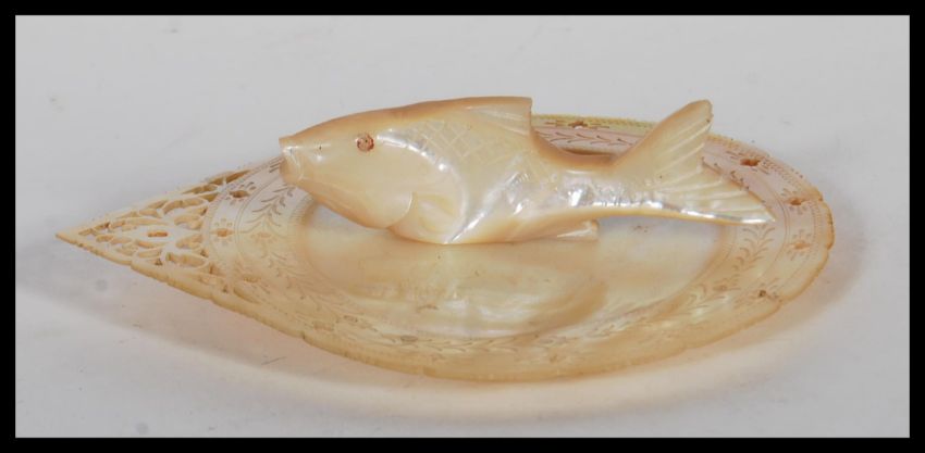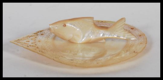 A 20th century engraved foliate mother of pearl dish with pierced decoration of circular form. Together with a polished stone Carp having a luster finish.
