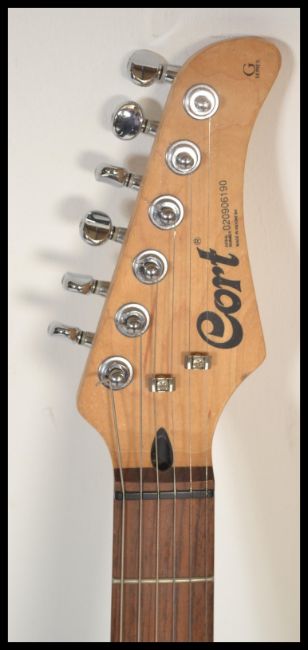 A 20th Century Cort G Series six string electric guitar, serial number 020906190, black finish to the body with a white scratch guard. In working order.
