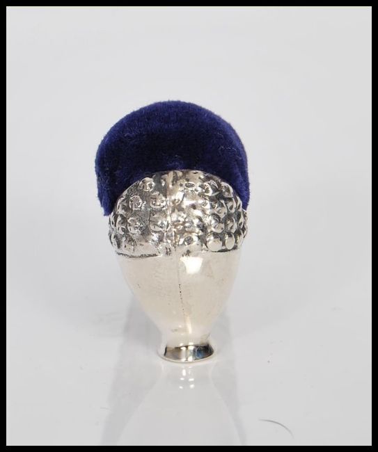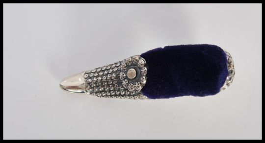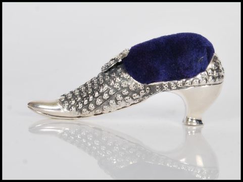 A sterling silver Victorian style pincushion in the form of a shoe having embossed decoration, with blue baize pin cushion to top. Stamped sterling to base.