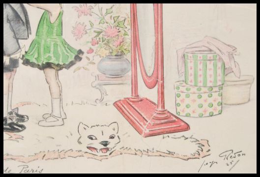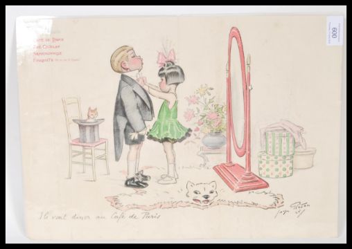 A early 20th Century 1927 Art Deco French drinks menu from Memes Maisons Cafe De Paris Pré Catelan Armenonville Fouquet's, having been drawn on by a French artist, signed to bottom right, depicting a young girl dressing a young boy, stood on a bear skin rug. To verso is a wine / champagne and cocktail list.