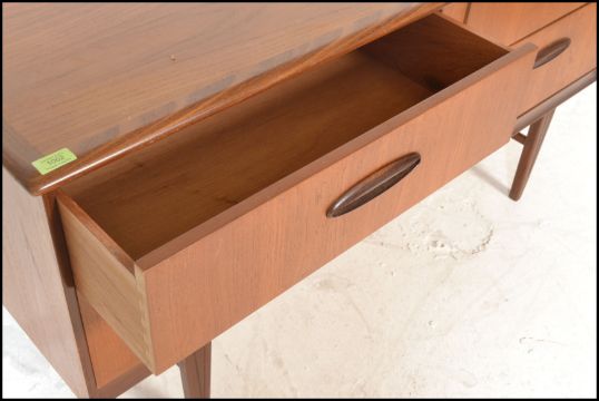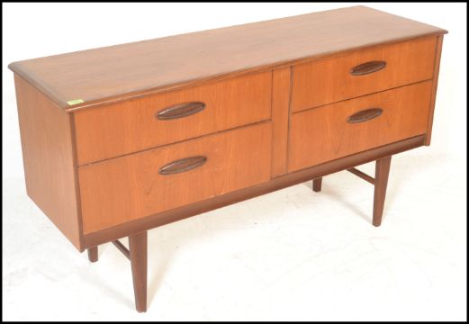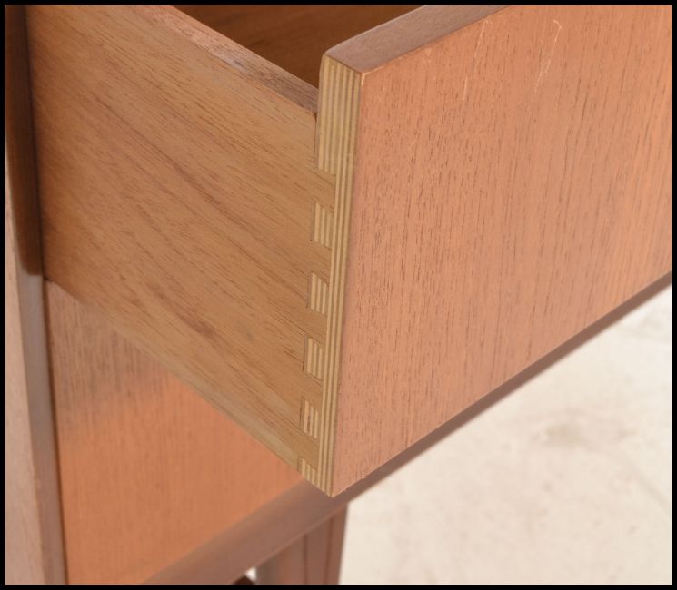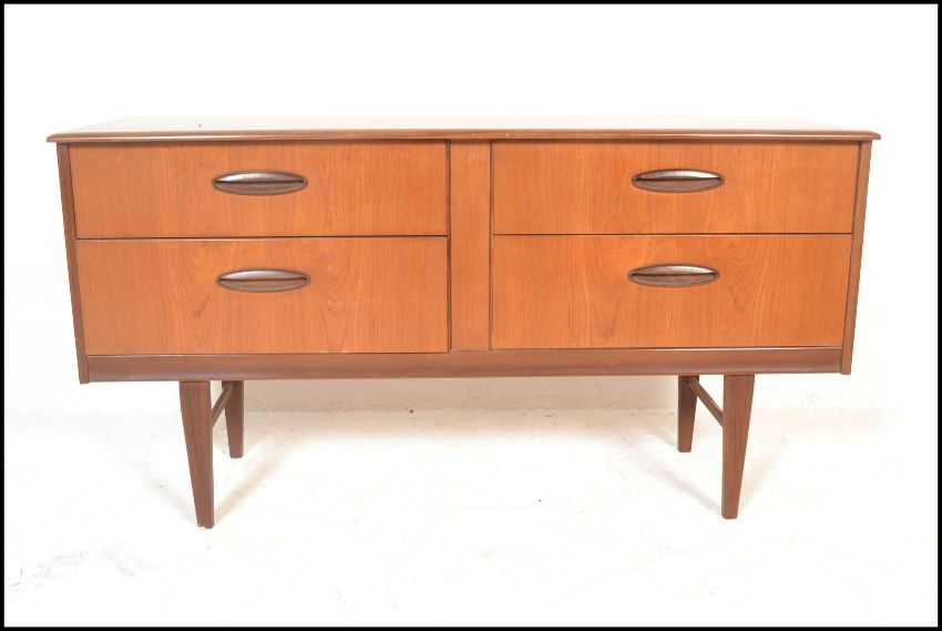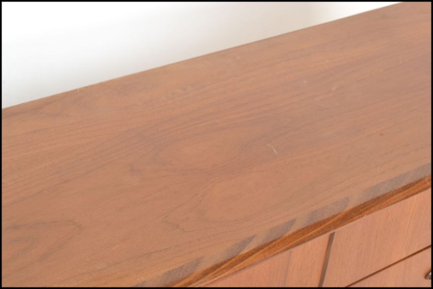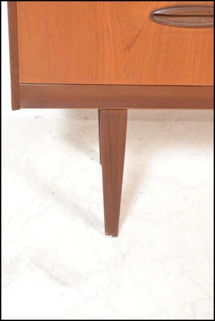 A retro 20th Century teak wood Danish inspired sideboard / credenza, having a twin bank of drawers raised on tapering turned supports. Measures 72H x 138W x 42D.