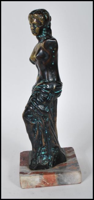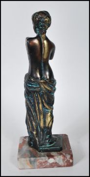 A 20th Century brass sculpture of Venus de Milo standing in typical classical pose having upper body naked with the lower body draped,raised on a square marble base.