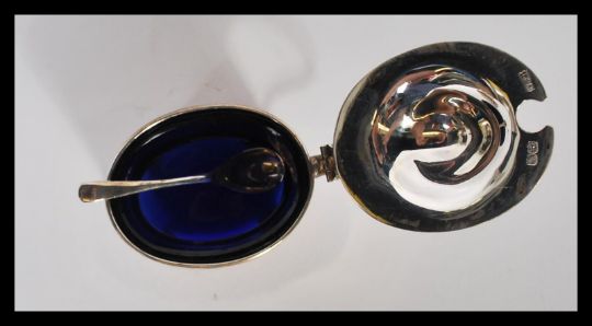 A silver hallmarked 3 piece condiment set comprising lidded and open pots, both with blue liners together with a pepperette. Complete with silver hallmarked spoons. Hallmarked for Walker & Hall. Birmingham date letter M for 1936. Weight 85.4g.