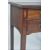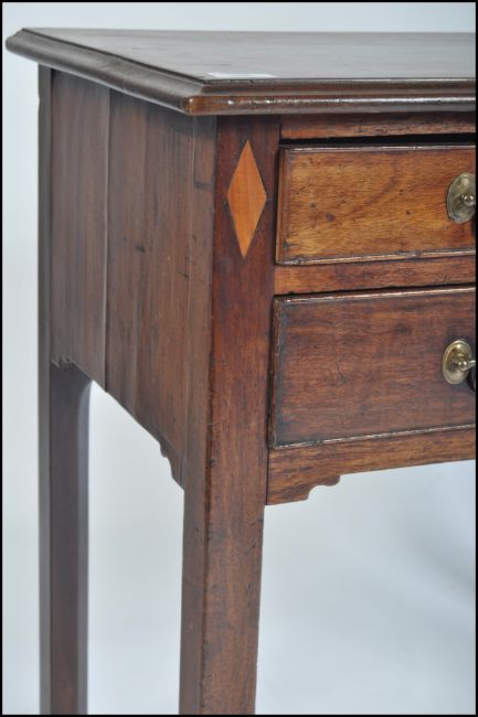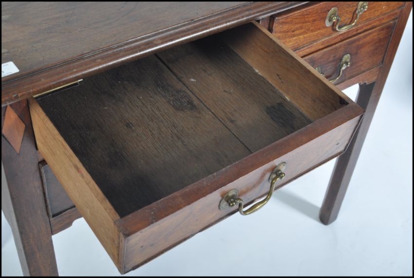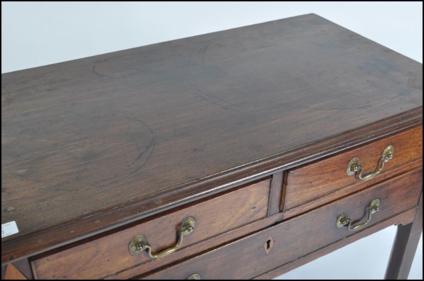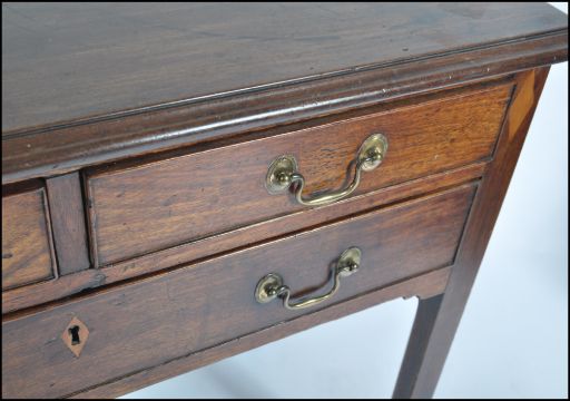 An 18th century George III mahogany lowboy writing table desk. Raised on squared legs with a series of drawers to the frieze having brass swing handles. Inset inlaid diamond lozenges to the sides. Above a flared chamfered edge desk top. Measures 73cms high x 82cms wide x 44cms depth