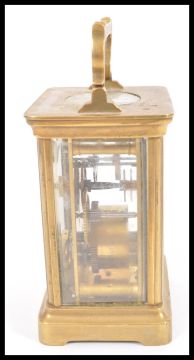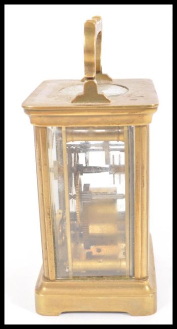 A 19th Century French gilt brass carriage clock having a white enamel face with Roman numeral chapter ring and faceted hands. Bevelled glass panels to sides with swing handles atop. Measures 12 cm high x 8 cm wide x 6.5 cm deep.