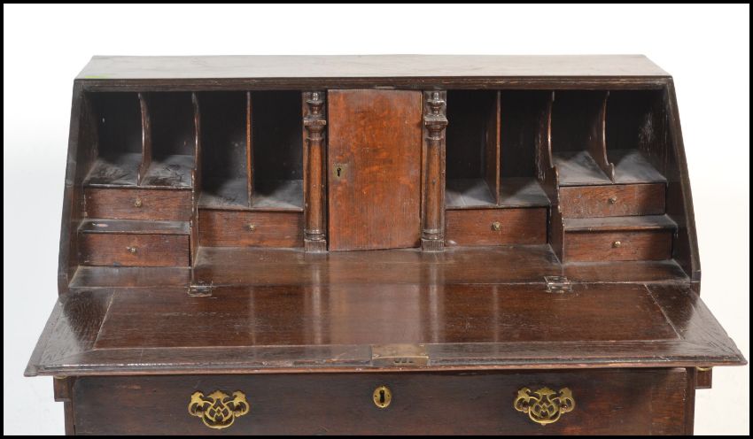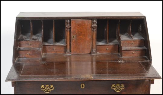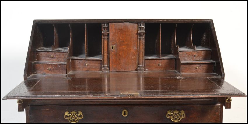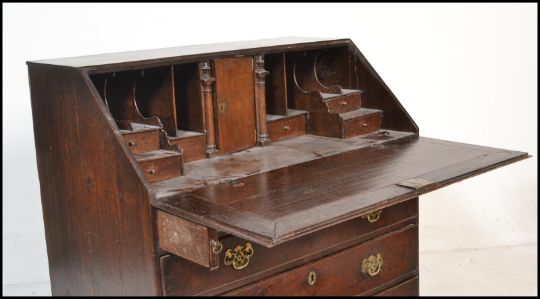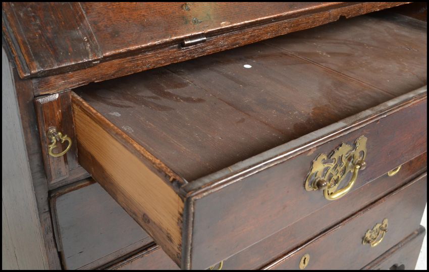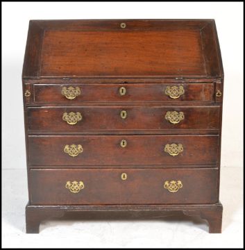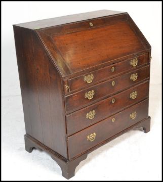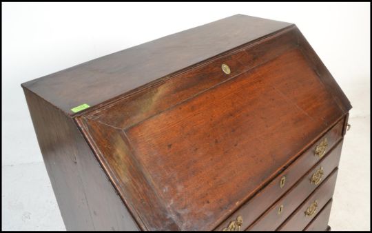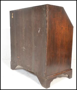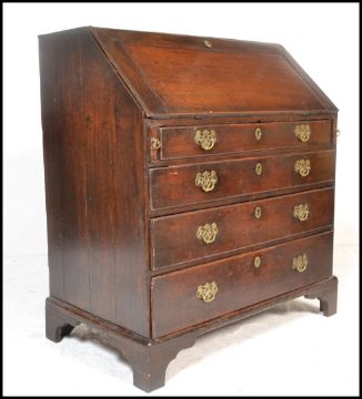 An 18th / 19th Century Georgian country oak  fall front bureau having a fully appointed interior over four graduating drawers and raised on bracket feet.