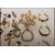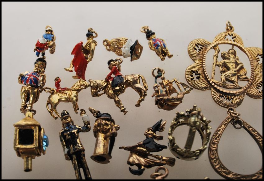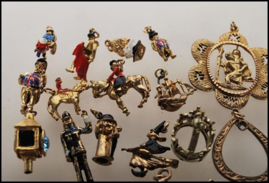 A small collection of yellow metal charms to include a policemen, post box, John Bull having a small dog with in, ship, witch, crown, motor car, lantern etc. Together with a pendant cross and another and earrings.