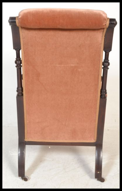 A 19th century Victorian mahogany Library / Salon chair upholstered in a ochre pinkish hue velour fabric raised on reeded turned supports terminating on castors. Measures 103cm x 60cm x 75cm.