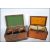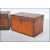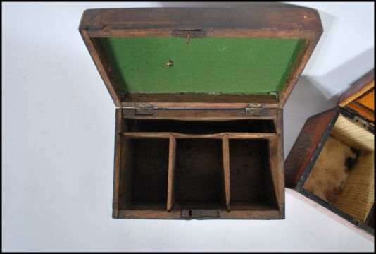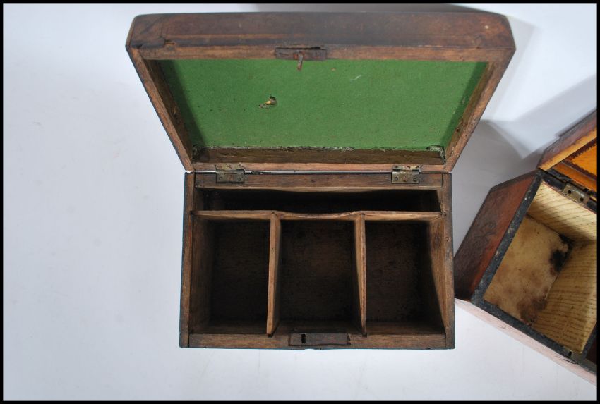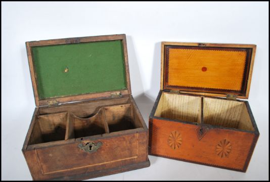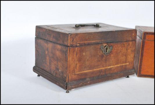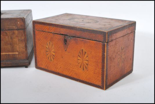 An 18th century satinwood tea caddy of smaller form with inlaid cartouche panel top with sunburst ovals to the front and spandrels. Sectional interior within. Together with another 18th century mahogany inlaid caddy raised on brass feet with handle atop. Satinwood measures 13cms x 21cms x 13cms / mahogany 14cms x 23cms x 14cms