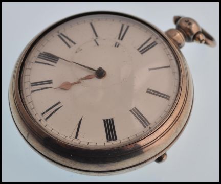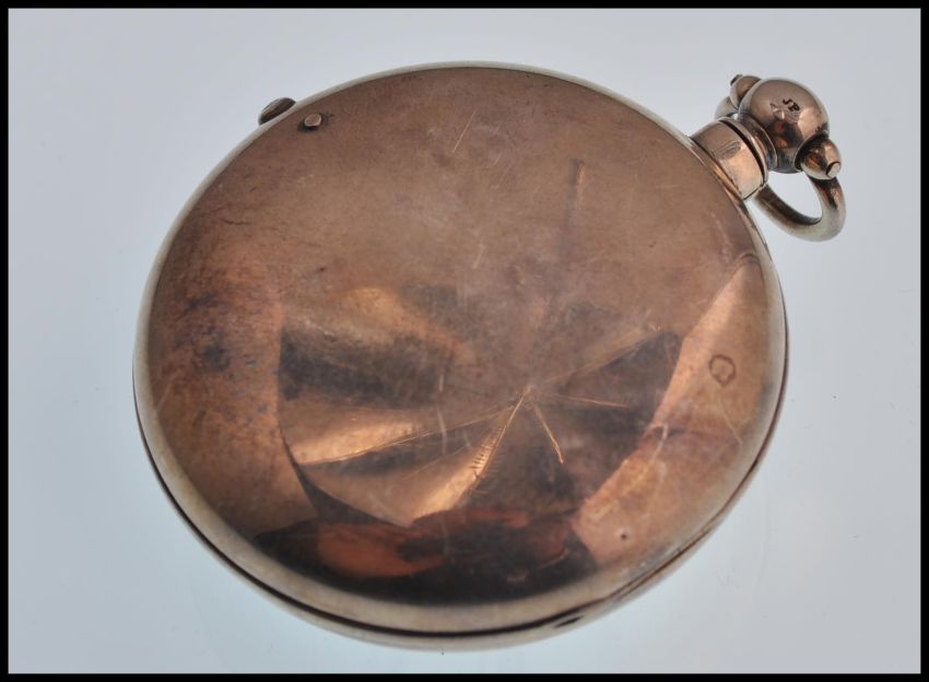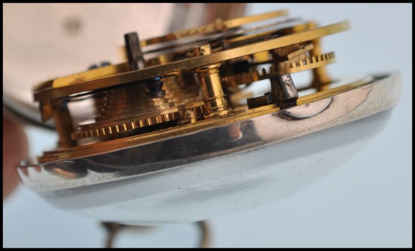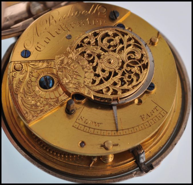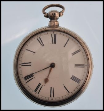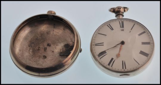 A William IV 1833 silver pair cased pocket fusee lever movement watch with bosley regulation and foliate pierced balance cock.  The movement signed A Bedwell of Colchester. White dial with roman numerals, bale atop. Total weight 160g