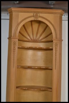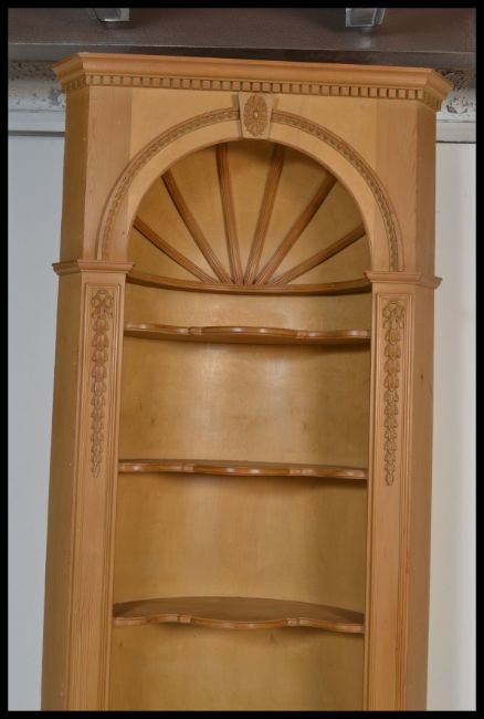 A Georgian revival 20th century pine open topped standing corner cupboard having adjustable shelves to an arched recess over planked cupboard door all raised on plinth base. Measures 240cms high x 90cms wide x 35cms deep.