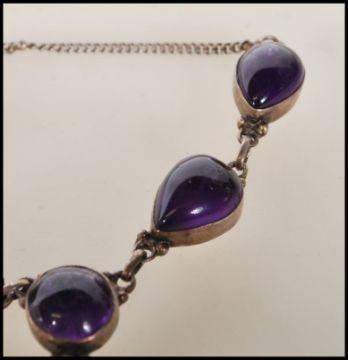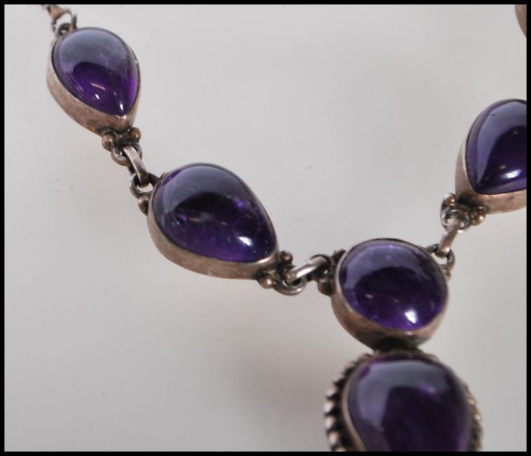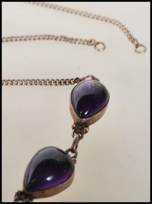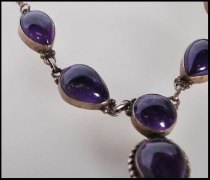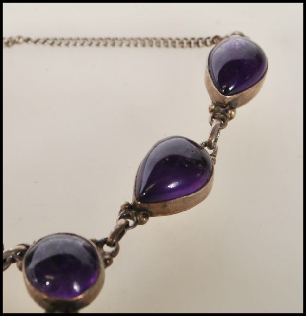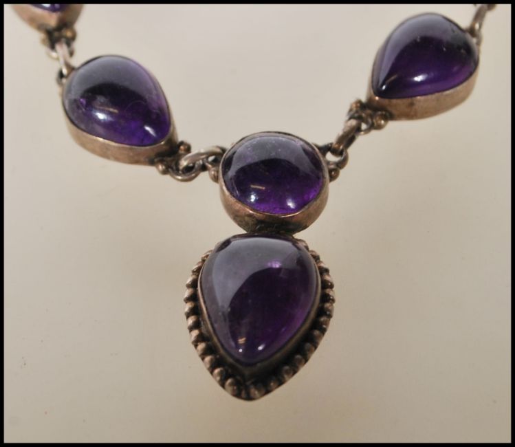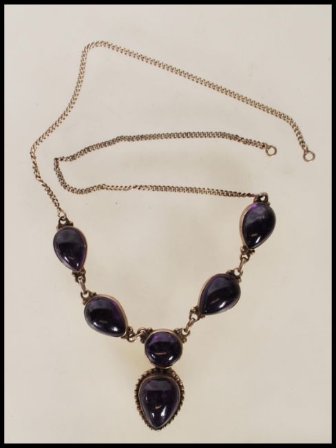 A stamped 925 silver necklace being set with a collar of six purple stone cabochons, having chain necklace above and a spring ring clasp.