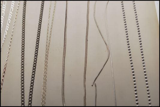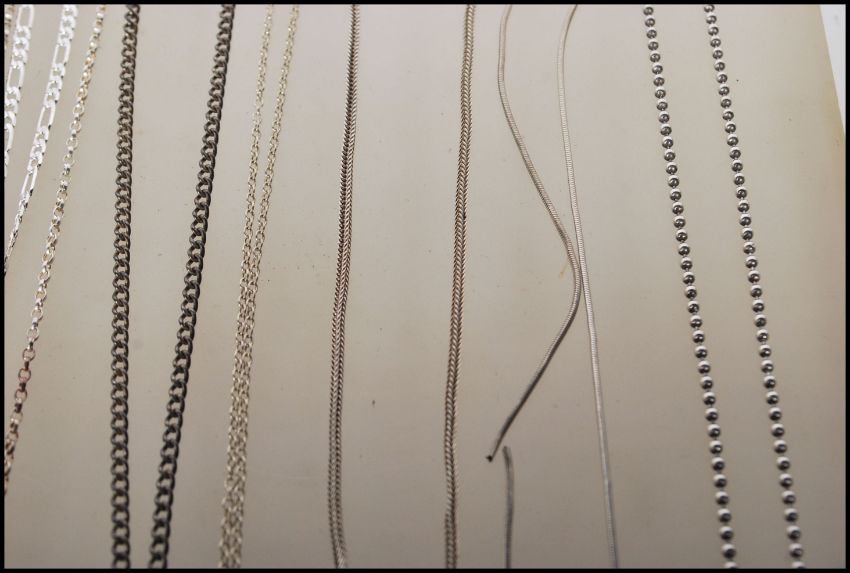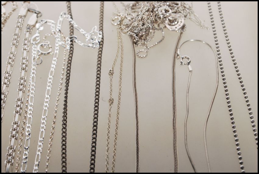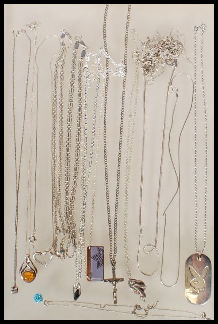 A selection of stamped 925 silver necklaces to include a playboy dog tag necklace, a flat link chain necklace with a blue stone pendant, an amber type stone pendant, a crucifix pendnat, a snake chain with a heart pendant set with a white stone and a selection of necklace chains of different styles. Total weight 101.9g.