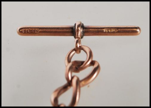 A 9ct gold curb link albert pocket fob watch chain bearing hallmark to every link and T bar, with later added clasp (not gold). Total weight 31.1g Measures: 14.5inch long