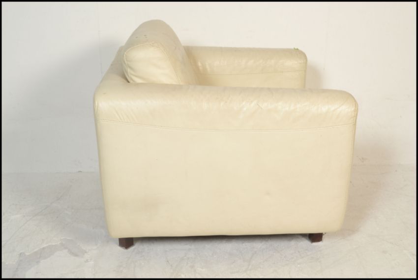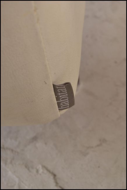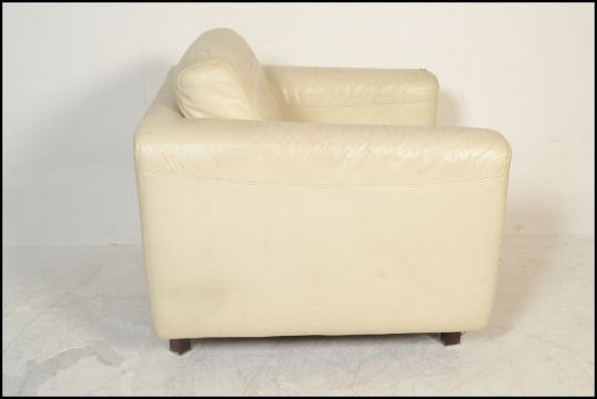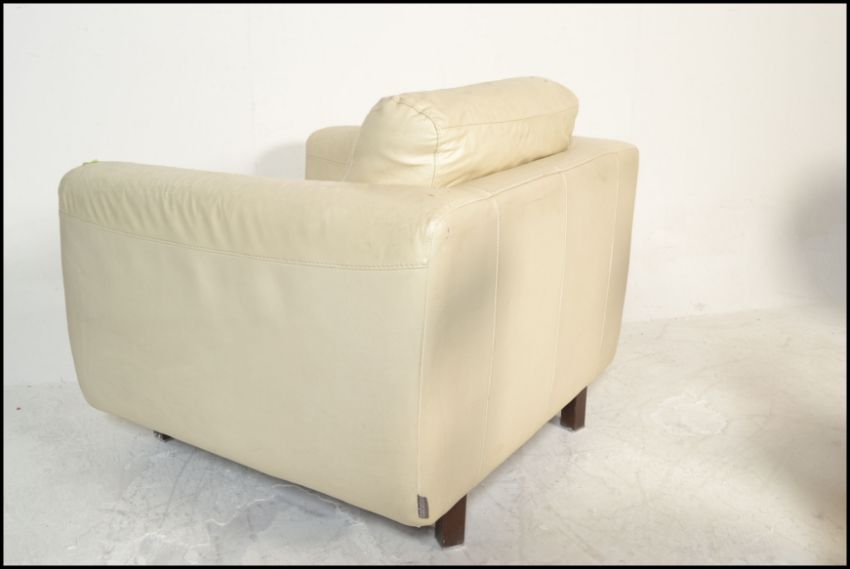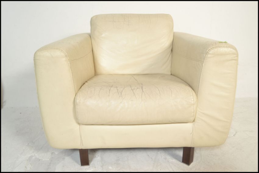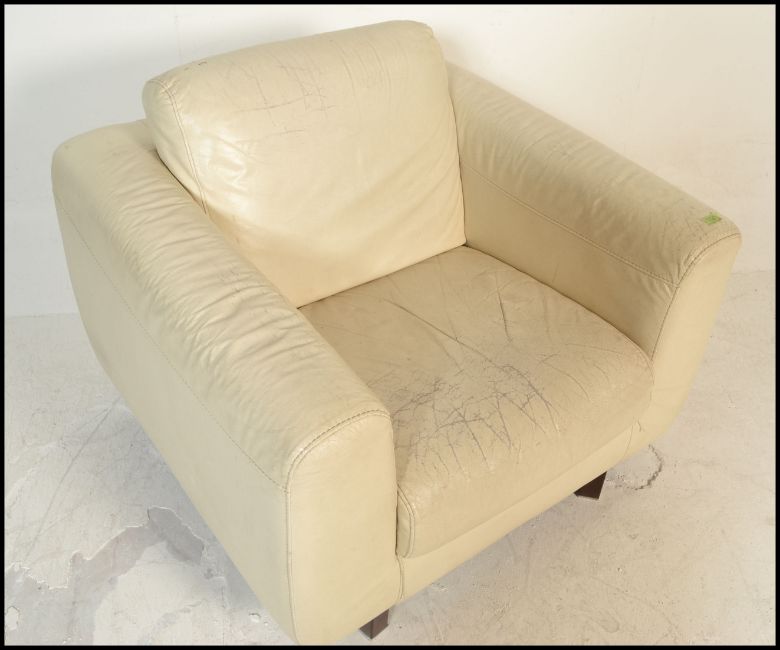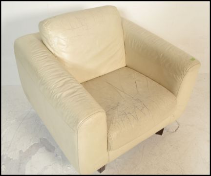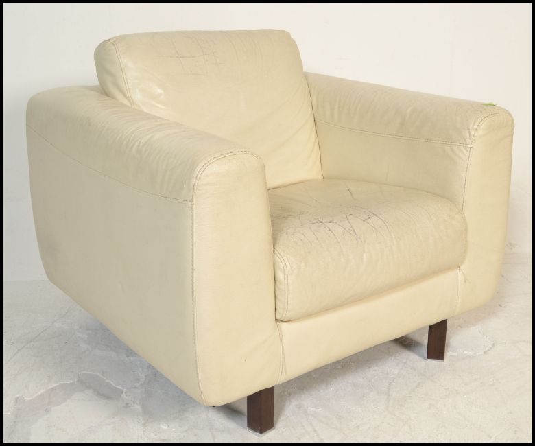 A retro cream leather armchair by Habitat raised on saquer wooden supports. Measures 82cms x 94cms x 94cms.