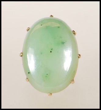 A ladies 9ct gold dress ring set with a large oval green nephrite cabochon. Unmarked but tests as 9ct gold. Size P. Gross weight 12.5g.