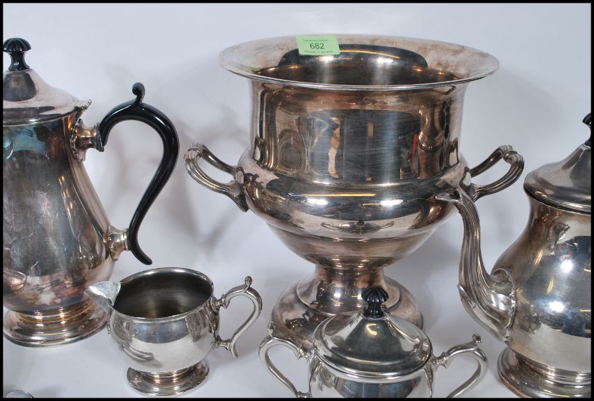 A mid 20th Century silver plated tea service consisting of teapot, water pot, creamer, sugar bowl set on gallery tray together with a twin handled baluster shaped wine cooler.