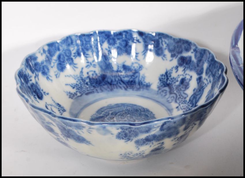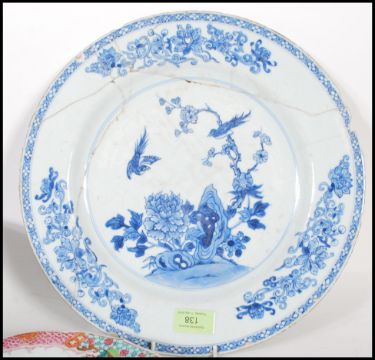 A group of Chinese ceramics dating from the 19th Century onwards to include a large centrepiece bowl having panels of floral decoration, a hand painted famille rose plate having floral sprays and scalloped decoration to the rim, and a blue and white painted plate hand painted decoration featuring birds, peonies and floral sprays. (AF).