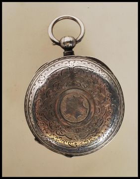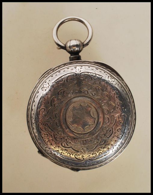 A stamped 935 continental silver open face pocket watch having a silvered dial with roman numeral chapter ring and subsidiary dial to six, having engraved floral patterning to the case and an unengraved armorial cartouche to the centre. Stamped 935 to the inside of the case.