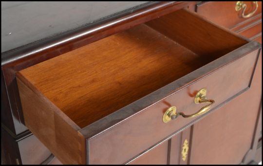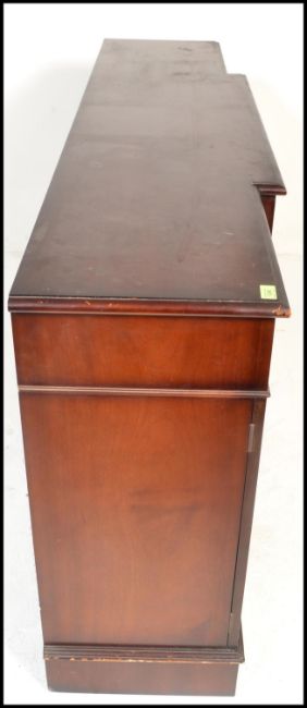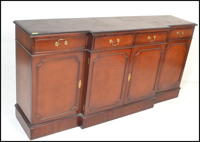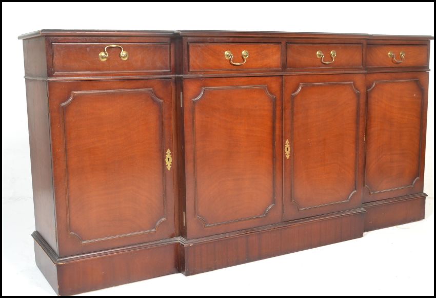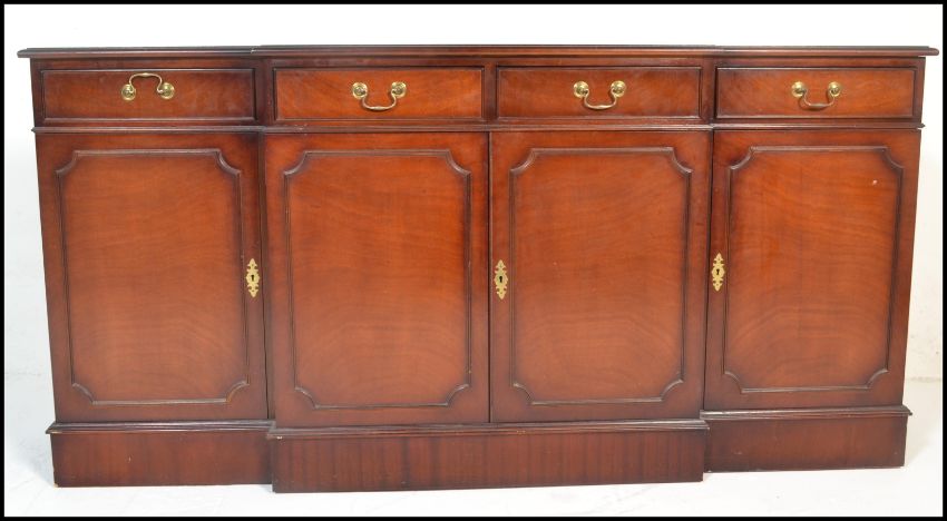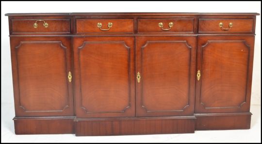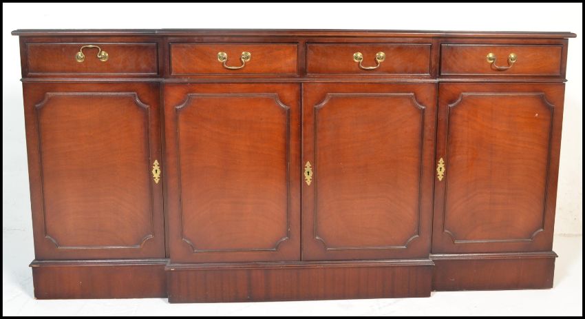 A large Georgian revival mahogany breakfront sideboard / dresser. Raised on a plinth base with a series of cupboards under short drawers above. Line inlaid details with brass swing handles. Measures 91cm x 180cm x 38cm