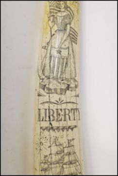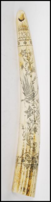 A 20th Century faux scrimshaw tusk engraved Liberty for the ship James Allen being engraved with the ship and 1840 to the back with floral sprays. Measures 55cm long.