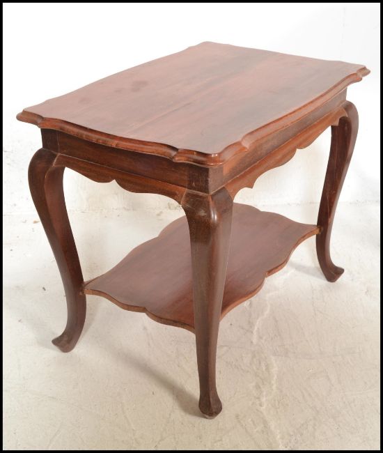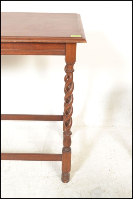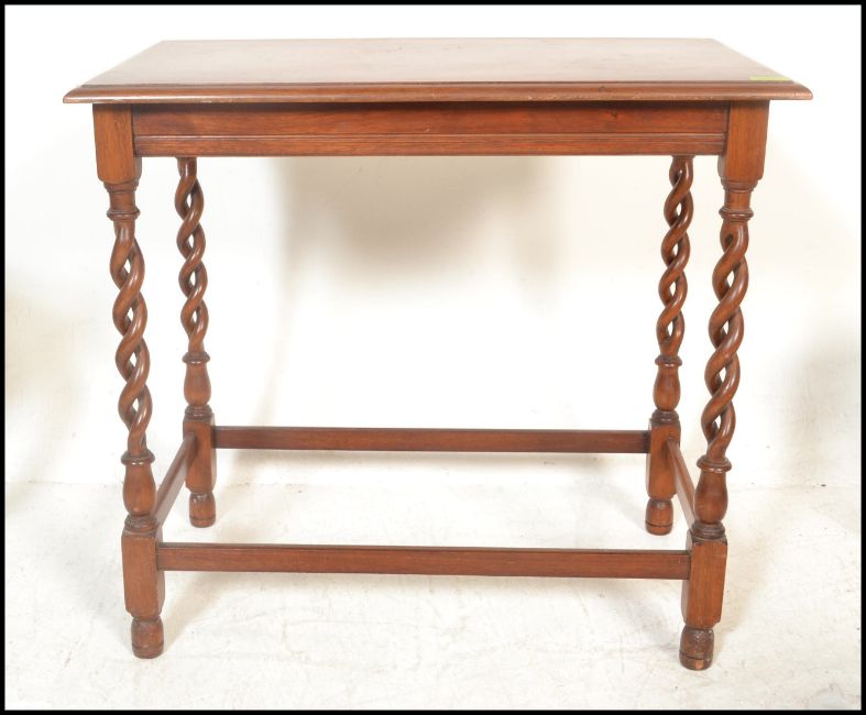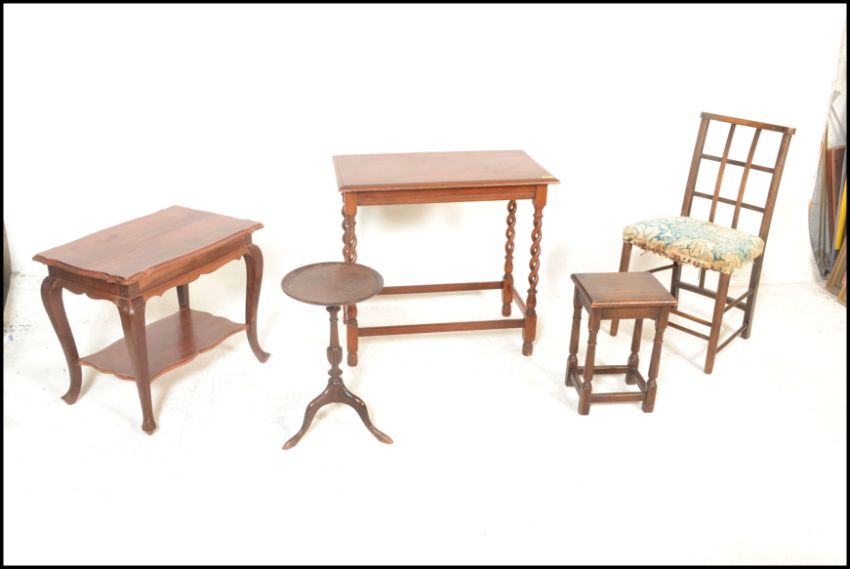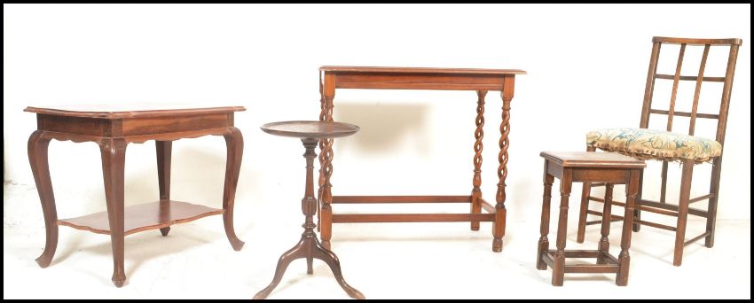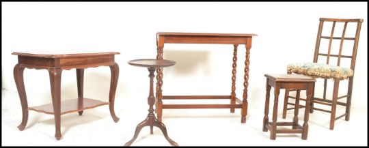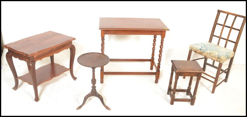 A good 1920's barley twist mahogany occasional table raised on pierced barleytwist uprights together with a teak wood occasional table, a mahogany wine table, portcullis backed nursing chair and a stool