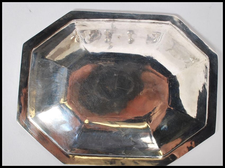A 20th Century silver hallmarked pin dish of octagonal form with patterned borders (hallmarked London 1923, weight 59.3g) along with an Elkington silver plated toast rack and a cut glass cruet set with fitted cut glass base.