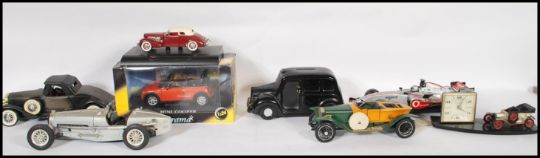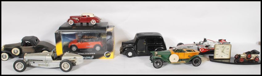 A collection of model scale diecast cars to include McLaren F1 car, Mini Cooper, Franklin Mint 1914 Rolls Royce, Bburago Bugatti Type 59 etc